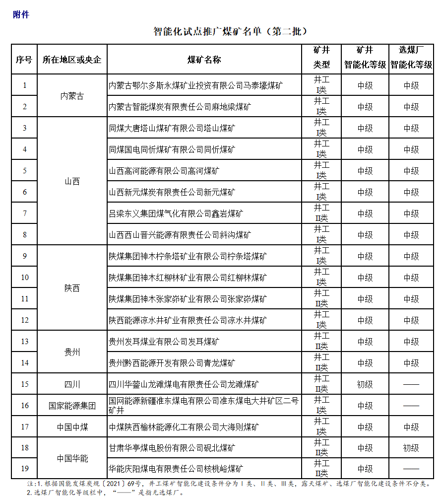 附件:智能化試點推廣煤礦名單(第二批)
