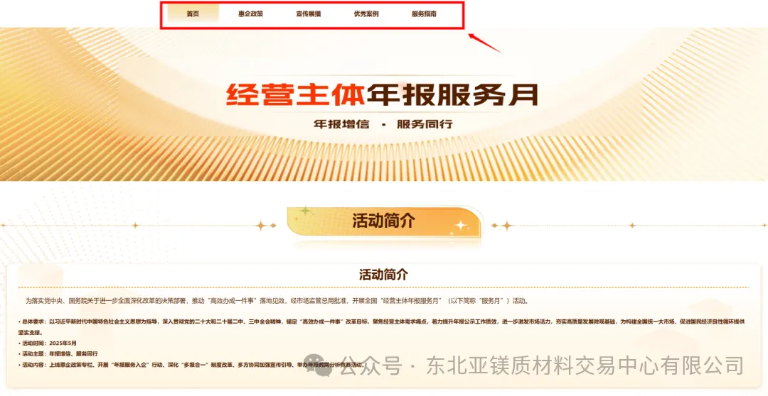 三、進入“經(jīng)營主體年報服務(wù)月”頁面后,可在上方選擇不同的子頁面閱覽各類信息,通過“惠企政策”“宣傳展播”“優(yōu)秀案例”等專欄可充分了解年報報送要求、注意事項、常見問題等信息,幫助大家更高效地掌握年報重點,提前規(guī)避可能存在的“坑”。